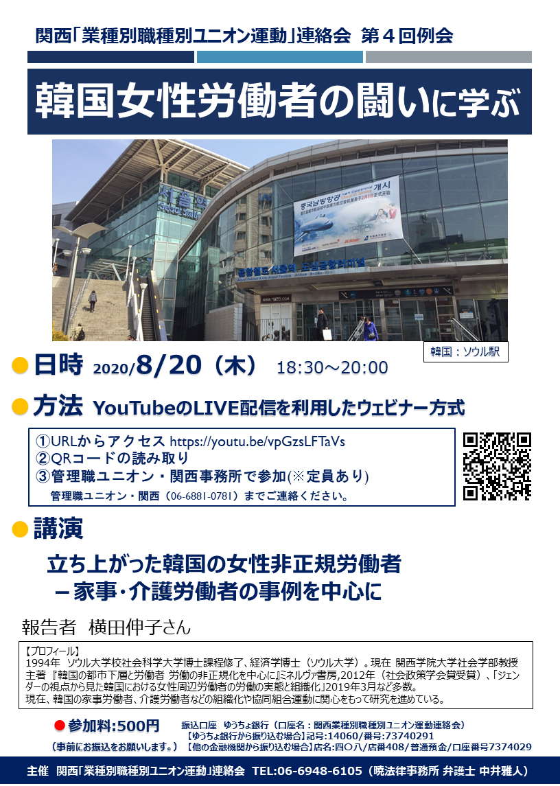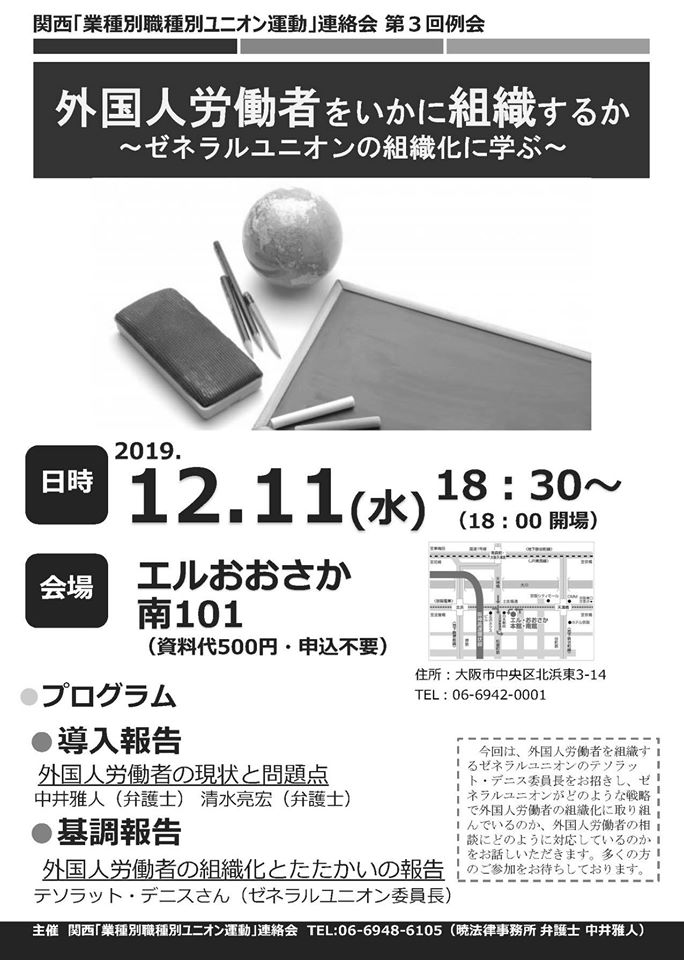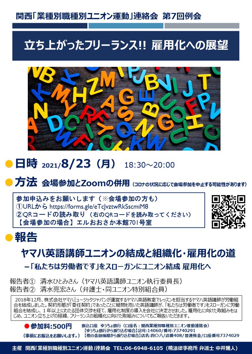 | ◆更新(2021.08.25) ◆関西「業種別職種別ユニオン運動」連絡会 第7回例会の報告 ●報告 ヤマハ英語講師ユニオンの結成と組織化・雇用化の道 ――「私たちは労働者です」をスローガンにユニオン結成と雇用化の道 ・と き:2021年8月23日(月)18時30分~20時30分 ・報告者① 清水ひとみさん(ヤマハ英語講師ユニオン執行委員長) 報告者② 清水亮宏さん(弁護⼠・同ユニオン特別組合員) ![]() ![]() (クリックしてfacebookで写真をご覧ください) ◆更新(2021.06.15) ◆関西「業種別職種別ユニオン運動」連絡会 第7回例会のご案内 ●報告 ヤマハ英語講師ユニオンの結成と組織化・雇用化の道 ――「私たちは労働者です」をスローガンにユニオン結成と雇用化の道 ・と き:2021年8月23日(月)18時30分~20時30分 ・報告者① 清水ひとみさん(ヤマハ英語講師ユニオン執行委員長) 報告者② 清水亮宏さん(弁護⼠・同ユニオン特別組合員) ●2018年12月、株式会社ヤマハミュージックジャパンが運営するヤマハ英語教室でレッスンを担当するヤマハ英語講師が労働組合を結成しました。契約形態が「委任契約」であったことに疑問を抱いた英語講師が、「私たちは労働者です」をスローガンに労働組合を結成し、1年以上にわたる団体交渉を経て、雇用化制度の導⼊を会社に決定させました。雇用化に向けた取組みをはじめ、ユニオン立ち上げの経緯、フリーランスの組織化に向けた取組みについてもご報告いただきます。 ●参加料:500円 (事前にお振込をお願いします。) ●振込口座 ゆうちょ銀行(口座名︓関西業種別職種別ユニオン運動連絡会) 【ゆうちょ銀⾏から振り込む場合】記号:14060/番号:73740291 【他の金融機関から振り込む場合】店名:四〇八/店番408/普通預金/口座番号7374029。 ●主催 関西「業種別職種別ユニオン運動」連絡会TEL:06-6948-6105(暁法律事務所弁護士中井雅⼈) ![]() ![]() △クリックしてPDFへへ。 ◆更新(2021.05.13) ◆関西「業種別職種別ユニオン運動」連絡会の第6回例会が4月13日(火)6時半からZoomによるオンライン例会として開催されました。 管理職ユニオン・関西の機関誌(2021年5月8日号、Vol.289)に発表されていますので転載します(「業種別職種別ユニオン運動」研究会) 「アメリカの社会運動ユニオニズムに学ぶ~草の根の社会運動と労働運動の連携」――講師 伊藤大一准教授) ![]() ◆全文は、下をクリックしてください。 ![]() ◆更新(2021.03.15) ◆関西「業種別職種別ユニオン運動」連絡会 第6回例会のご案内 :アメリカの社会運動ユニオニズムに学ぶ ~草の根の社会運動と労働運動の連携~ ・と き:2021年4月13日(火)18時30分~20時30分 ・・講 師 伊藤大一さん(大阪経済大学) 【プロフィール】 大阪経済大学 経済学部 准教授 著書として 『非正規雇用と労働運動-若年労働者の主体と抵抗』法律文化社、2013年など。2016年、アメリカに留学し、アメリカの労働組合の再復興戦略などについて調査。社会運動ユニオニズムにも触れ、アメリカの労働運動に詳しい。 ・開催方法 Zoomによるオンライン例会(※要申込み) 参加方法(申込みフォームによる申込み) ①URLから https://forms.gle/CBR53jmYDyBrGcrN7 ②QRコードの読み取り (右のQRコードを読み取ってください) ③管理職ユニオン・関西事務所で参加(※定員あり)、06-6881-0781までご連絡ください。 ・連 絡 先 06-6948-6105(暁法律事務所 中井雅人弁護士) ![]() ![]() △クリックしてPDFへへ。 ◆更新(2020.07.25) ◆コロナウイルスの感染をさけるために日程と参加方法(Youtube配信へ)を変更しました。 :韓国女性労働者の闘いに学ぶ――関西「業種別職種別ユニオン運動」連絡会第4回例会 ・と き:2020/8/20(木)18:30~20:00 ・方 法:YouTubeのLIVE配信を利用したウェビナー方式 ①URLからアクセス https://youtu.be/vpGzsLFTaVs ②QRコードの読み取り ③管理職ユニオン・関西事務所で参加(※定員あり)・管理職ユニオン・関西(06-6881-0781)までご連絡ください。 ![]() ◆更新(2020.04.13)(以下、コロナ感染を避けるために「延期」しました)。 ◆コロナウイルスの感染をさけるために日程を変更しました。 :韓国女性労働者の闘いに学ぶ――関西「業種別職種別ユニオン運動」連絡会第4回例会 ・と き 2020年4月22日(水)、18:30~20:30 ・ところ エル・おおさか 南 72 ![]() ◆更新(2020.02.01) 関西「業種別職種別ユニオン運動」連絡会 第3回例会報告 ◎「外国人労働者をいかに組織化するか―ゼネラルユニオンの組織化から学ぶ」 ・基調報告:「外国人労働者の現状と問題点」(清水弁護士と中井弁護士から→技能実習生・入管法の改定の狙い問題など)。加えて、ゼネラルユニオン委員長 テソラット・デニス委員長から「外国人労働者の組織化とたたかい」の報告。 ・と き:12月11日(水)午後6時30分、 ・ところ:エルおおさか南101、大阪市中央区北浜東3-14。 ・関西「業種別職種別ユニオン運動」連絡会第3回例会。 「業種別職種別ユニオン運動」研究会のページにUPしました。 昨年12月11日、エルおおさかで開始された。 最初に伊藤さんから主催者あいさつ。今の日本の企業別労働組合は労働組合でない。